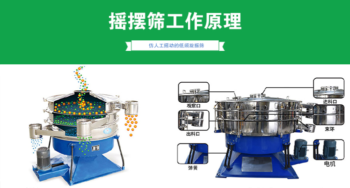 搖擺式振動(dòng)篩是一種仿人工搖動(dòng)的低頻旋振篩,其原理是:瞬時(shí)運(yùn)動(dòng)為沿徑向的位移和以此位移為軸的圓周運(yùn)動(dòng)的合成(螺旋運(yùn)動(dòng))。即可調(diào)節(jié)偏心距的激振器產(chǎn)生了非線性三維運(yùn)動(dòng),物料也產(chǎn)生同樣的近似手動(dòng)作業(yè)的運(yùn)動(dòng),從而達(dá)到篩分之目的,再配合篩分附件可得到更加理想的篩分效果;適合于圓球狀、圓柱狀、片狀、乃至不規(guī)則形狀易堵網(wǎng)且需要精密篩分的物料。