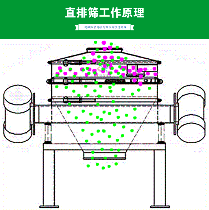 由直立式電機(jī)作激振源,電機(jī)上、下兩端安裝有偏心重錘.將電機(jī)的旋轉(zhuǎn)運(yùn)動(dòng)轉(zhuǎn)變?yōu)樗健⒋怪薄A斜的三次元運(yùn)動(dòng),再把這個(gè)運(yùn)動(dòng)傳遞給篩面。調(diào)節(jié)上、下兩端的相位角.可以改變物料在篩面上的運(yùn)動(dòng)軌跡。適合食品、制藥、化工、冶金等行業(yè)。