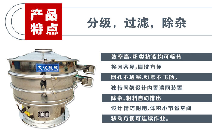 1000mm振動篩又叫做1000型振動篩,本產(chǎn)品為1000mm直徑兩層三個出料口不銹鋼三次元振動篩,子母網(wǎng)分離式網(wǎng)架,篩機整體為不銹鋼材質,符合國家衛(wèi)生標準,主要用于食品、醫(yī)藥行業(yè)的篩分。 "大漢"DH系列振動篩產(chǎn)品,經(jīng)客戶多年使用,獲得大量的一線反饋建議,在自有成熟的篩機制造技術基礎上,大漢機械工程師以滿足客戶需求為標準,多次技術改進,篩分效果更加優(yōu)越,采用"通用"動力激振器,三維動力更加突出,適用范圍更加廣泛,大漢機械公司可根據(jù)客戶需求設計特殊型號,無論物料是干是濕,是精細是粗糙,是比重大是比重輕,0-400目都可以篩選,不管是液態(tài),還是漿狀的0-600目都可以過濾。"大漢"旋振篩系列產(chǎn)品同時配備專門的篩網(wǎng)清理裝置,把堵網(wǎng)率降低,過網(wǎng)率和處理精度得以有效提高。"大漢"具備特殊型號制造的能力讓顧客對"大漢"有更多的選擇。
