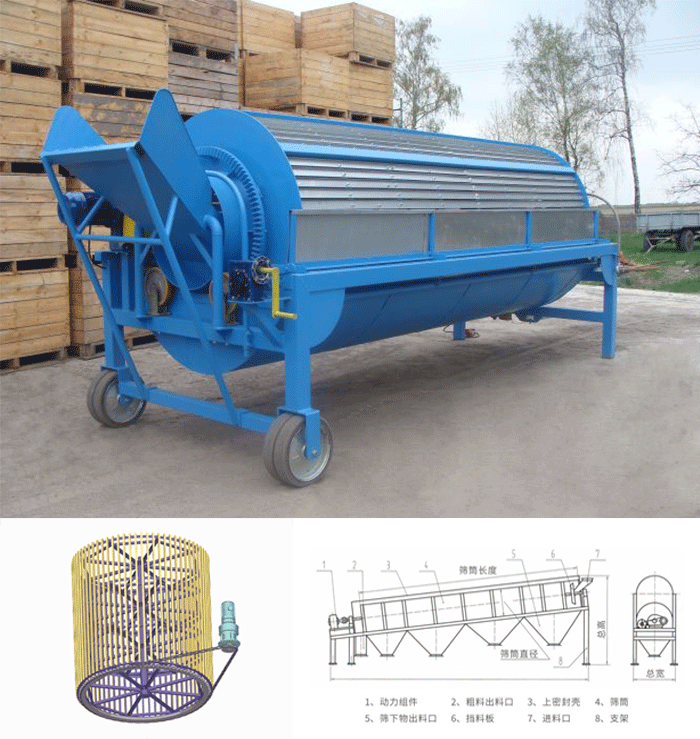 滾筒篩沙機(jī)主要有電機(jī)、減速機(jī)、滾筒裝置、機(jī)架、密封蓋、進(jìn)出料口組成。