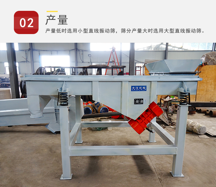 產量低時選用小型直線振動篩,篩分產量大時選用大型直線振動篩