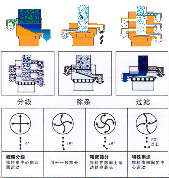 不銹鋼振動(dòng)篩采用YZUL立式振動(dòng)電機(jī)作為激振源,通過振動(dòng)電機(jī)上下兩端的偏心重錘將旋轉(zhuǎn)運(yùn)動(dòng)轉(zhuǎn)變?yōu)樗健⒋怪薄A斜的三次元運(yùn)動(dòng),并傳遞到旋振篩的篩面上;物料通過入料口進(jìn)入設(shè)備內(nèi),根據(jù)不同物料篩分要求,物料經(jīng)過1-5層采用不同目數(shù)的金屬編織篩網(wǎng)的篩分層,在這個(gè)過程中,位于各層的篩網(wǎng)下的清網(wǎng)裝置(彈跳球)通過頻率振動(dòng)不斷撞擊不銹鋼篩網(wǎng),使篩網(wǎng)上層物料能夠順暢的透網(wǎng)篩分,并有效解決了物料堵網(wǎng)問題出現(xiàn),不同目數(shù)的物料通過各層對(duì)應(yīng)目數(shù)的篩網(wǎng)后在各層的出料口排出,最終實(shí)現(xiàn)篩選除雜或過濾分級(jí)的目的。