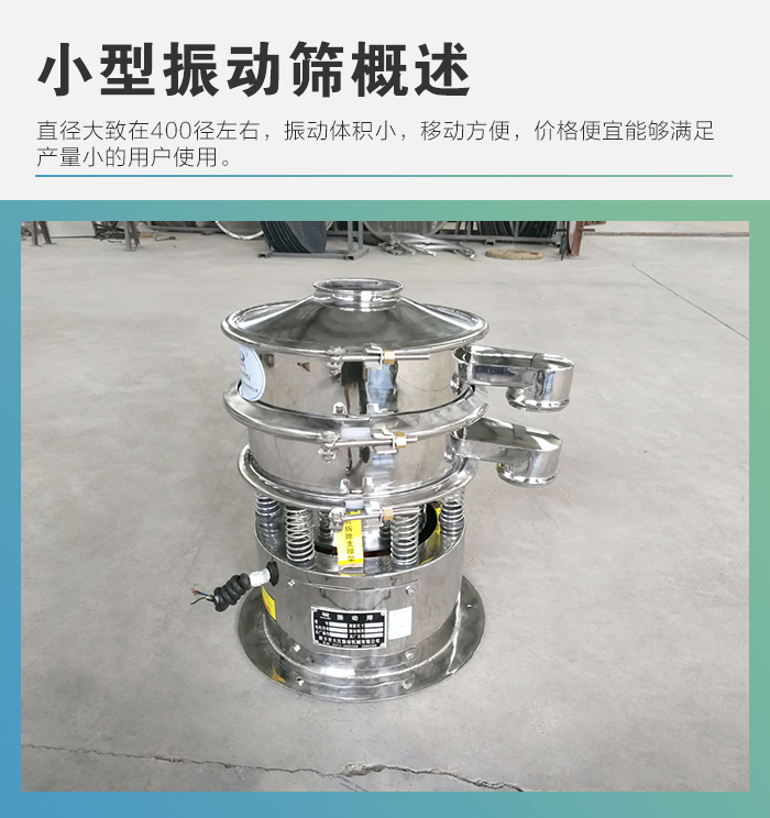 小型振動篩為400mm直徑一層兩個出口不銹鋼振動篩,整機(jī)采用304不銹鋼材質(zhì),廣泛應(yīng)用于食品,醫(yī)藥,顆粒型物料的篩分行業(yè)。