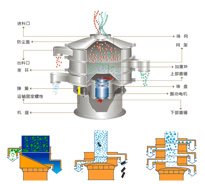 小型不銹鋼振動篩是由直立式振動電機(jī)作為激振源,電機(jī)上、下兩端安裝有偏心重錘,將電機(jī)的旋轉(zhuǎn)運(yùn)動轉(zhuǎn)變?yōu)樗健⒋怪薄A斜的三次元運(yùn)動,再把這個運(yùn)動傳遞給篩面進(jìn)行篩分。調(diào)節(jié)上、下兩端的相位角,可以改變物料在篩面上的運(yùn)動軌跡。